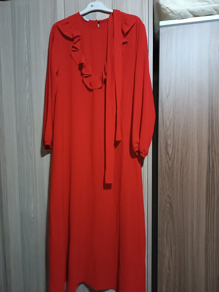 Kırmızı uzun elbise, uzun kollu ve V yakalı, drapeli detaylara sahip. Salaş kesimiyle sokak modasına uygun, gündelik kullanıma elverişli. Canlı renkli, desensiz ve sentetik kumaştan.