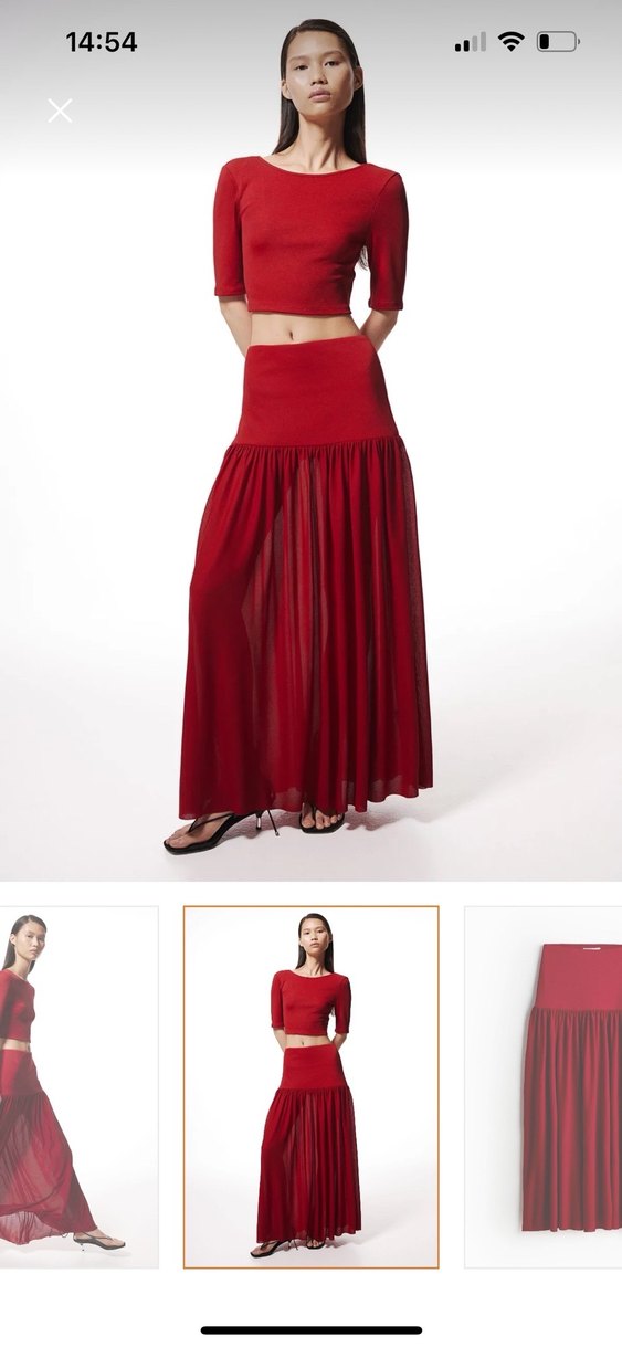 Koyu kırmızı, uzun ve salaş kesimli, satenimsi dokulu, drapeli kadın eteği. Minimalist ve normcore tarzıyla romantik buluşmalar için ideal.