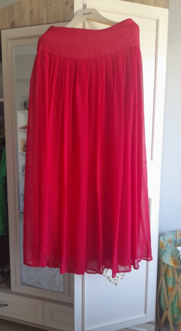 Parlak kırmızı uzun etek, saten dokulu ve salaş kesimlidir. Bohem tarzıyla romantik akşamlar için uygundur.
