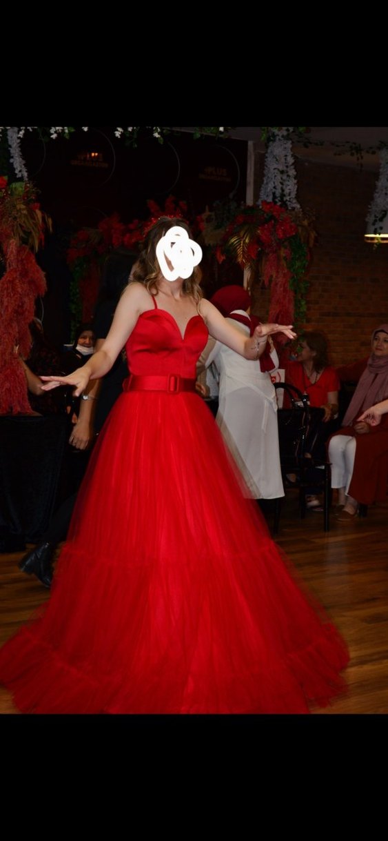 Kırmızı, straplez yaka ve askılı kollara sahip, bele oturan uzun abiye elbise. Kemer detayıyla avant-garde ve şık bir görünüm sunar. Kına elbisesi nova sposa marka