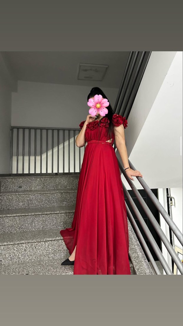 Kırmızı Uzun Straplez Çiçekli abiye