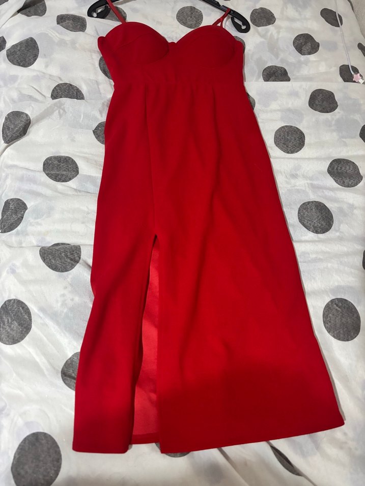 Uzun, kırmızı, straplez ve kolsuz, drapeli detaylı, vücuda oturan gece elbisesi. Parlak kumaşı romantik akşamlar için ideal.