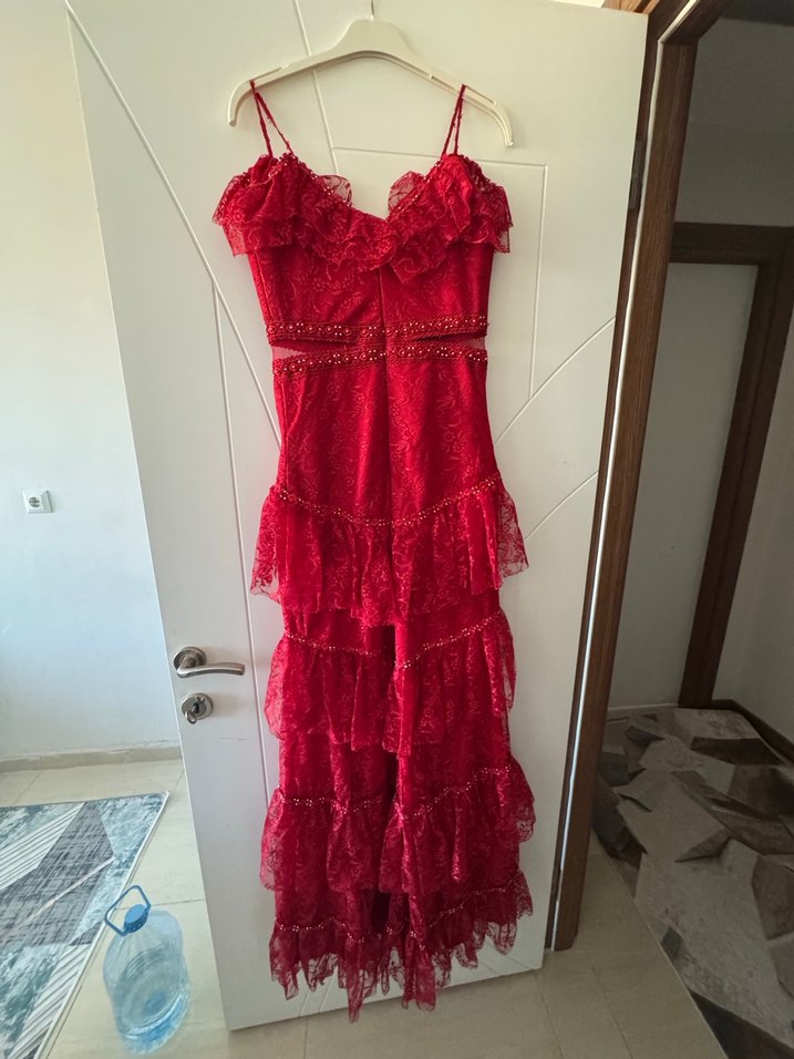 Kırmızı Uzun Straplez Fırfırlı Elbise