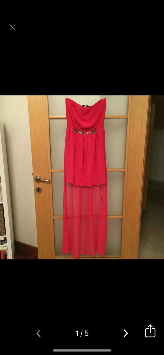 Bu kırmızı, straplez abiye elbise, kemerli bel detayı ve şeffaf alt katmanlı uzun etek kısmıyla dikkat çeker. Romantik akşamlar için uygundur.