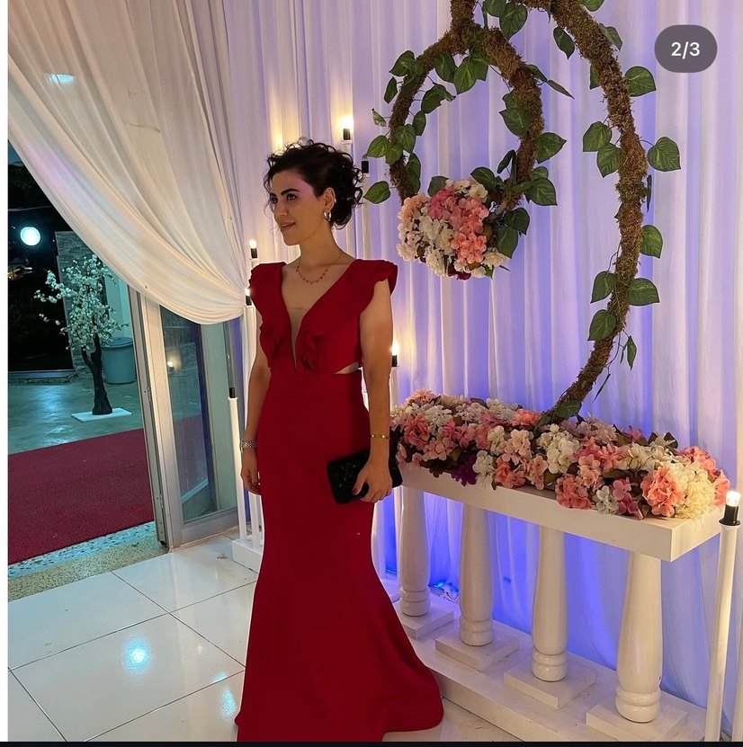 Kırmızı Uzun V Yaka Kadın Abiye Elbise