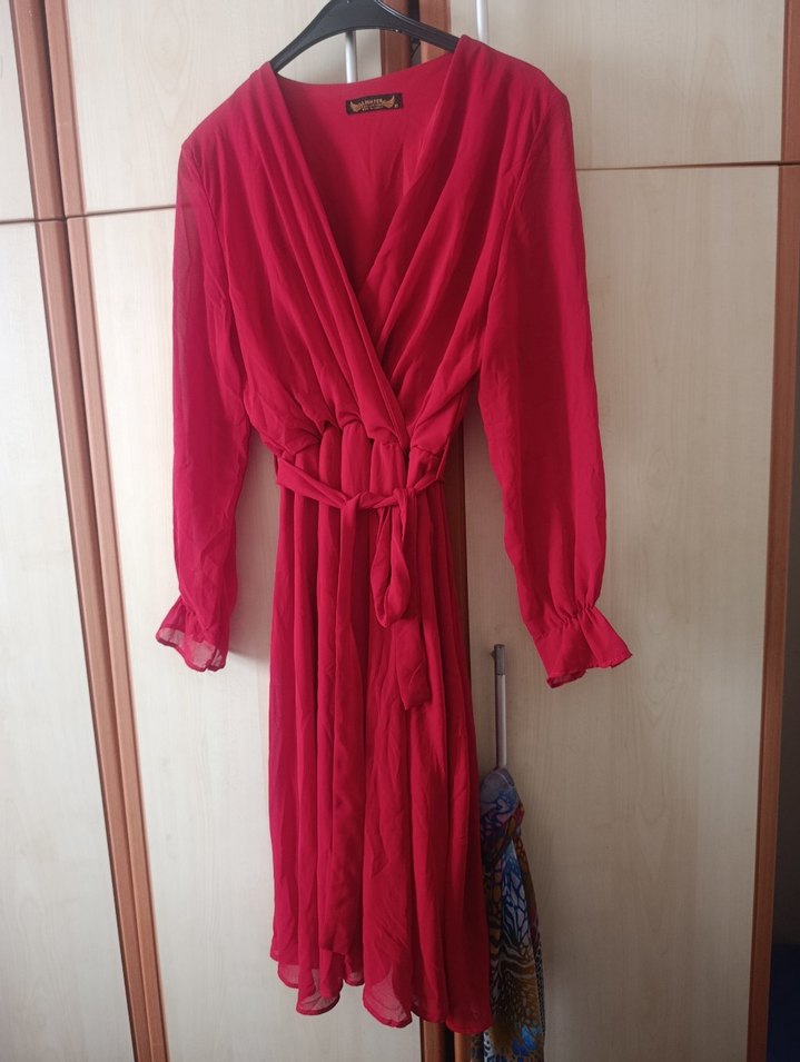 Kırmızı uzun elbise, V yaka ve pileli uzun kollara sahiptir. Bol kesim ve ipeksi dokusuyla romantik akşamlar için uygundur. Desensiz ve bohem tarzda. 172 boyda diz ortasında kalıyor . kusagind ahafif sokulme var