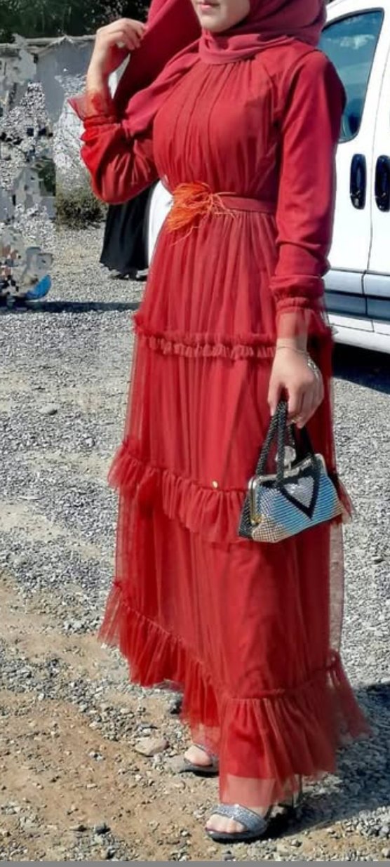 Kırmızı uzun elbise, volan detaylı ve bol kesimdir. Sentetik kumaştan, işlemeli desene sahiptir. Askısız yaka ve parlak renklidir, günlük kullanıma uygundur.