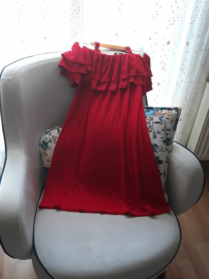 Uzun kırmızı penye elbisesi, straplez yakası ve volan detayları ile bohem tarzını yansıtır, rahat ve salaş kesimlidir. hiç kullanılmadı penye esnek s den XL kadar olur