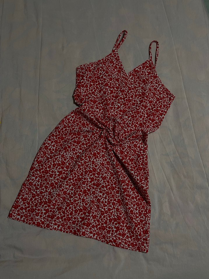 Kırmızı renkli, V yakalı ve askılı mini elbise, sentetik kumaştan yapılmıştır. Drapeli detayları ve renkli batik deseniyle günlük sokak stiline uygundur.