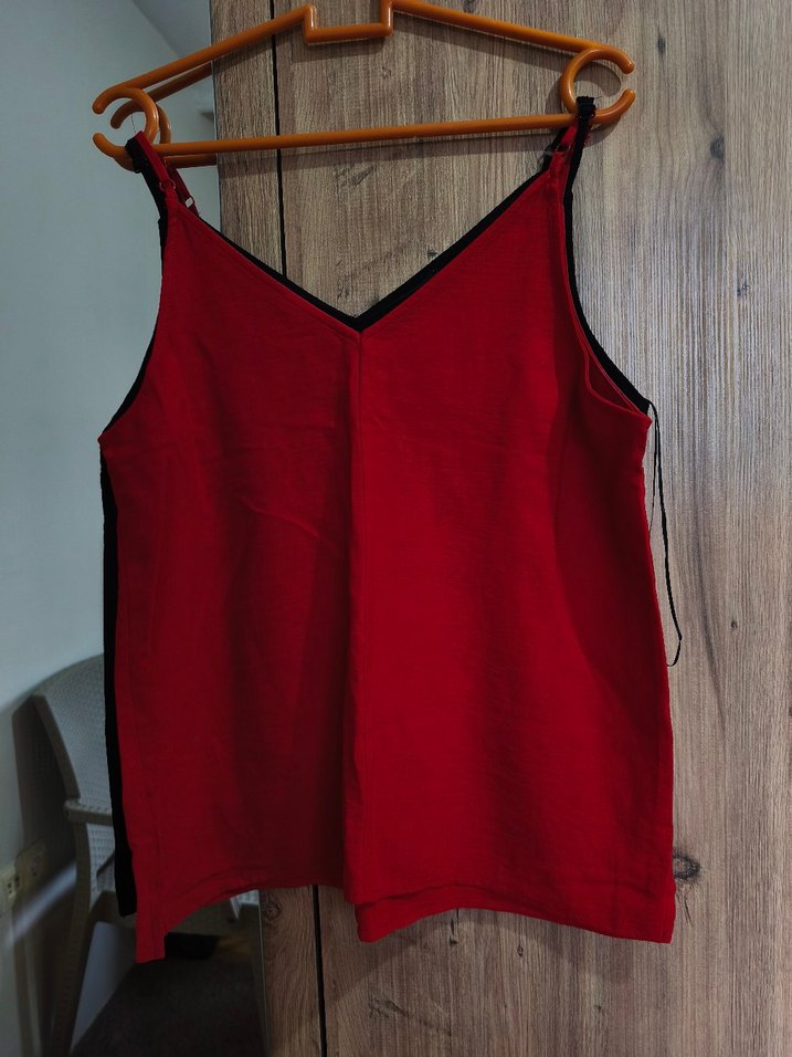 Kırmızı askılı mini kadın bluz, V yaka ve bol kesimdir. Tekstil kumaştan yapılmış, gündelik kullanım için rahat ve şık bir tasarıma sahiptir. 2'li olarak satışta