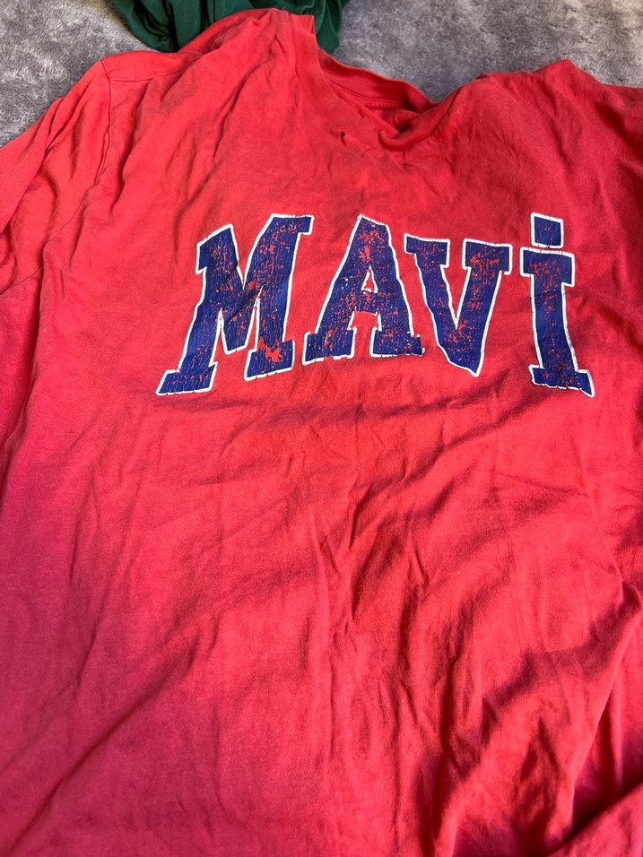 Kısa kollu, V yaka, bol kesim kırmızı hamile tişörtü. Üzerinde "MAVI" baskısı bulunur, spor ve rahat kullanıma uygundur.