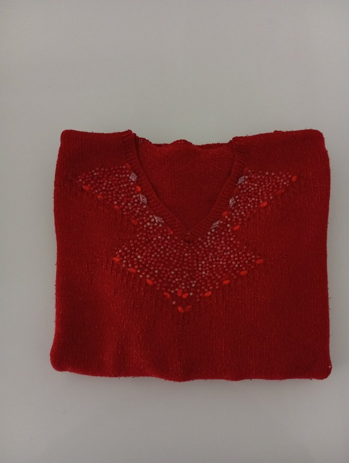 Kırmızı renkli, V yakalı, nakışlı uzun kollu kısa ve bol kesim bohem kadın kazak. simlidir.Anne kazağı. Ürün bir iki defa giyildi. Fazlalılıktan dolayı satıyorum boyu 58 cm, eni 43 cm