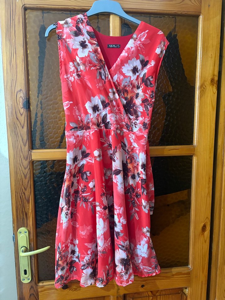 Kırmızı, kolsuz, V yakalı, bol kesim midi elbise. Yumuşak sentetik kumaştan, renkli batik desenli ve drapeli detaylara sahip, bohem tarz için uygun. 48 yazıyor ama44 bedene olur