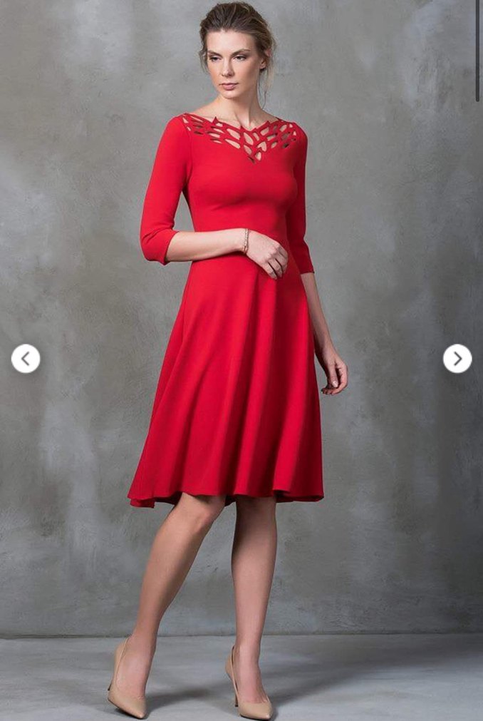 V yaka dantel detaylı, kırmızı renkli, midi boy, kalıp oturan elbise S ve M bedene uyumlu