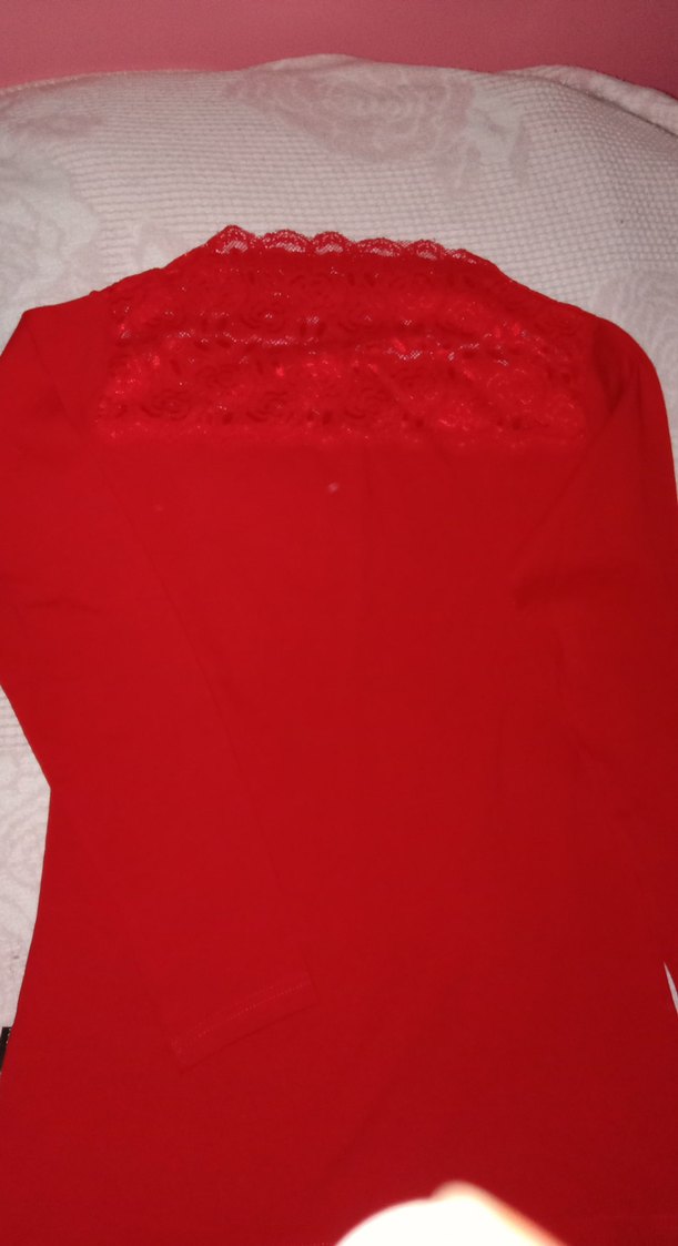 Kırmızı, uzun kollu, V yaka detayi dantel, sade ve rahat kesim kadın penye. ❤️