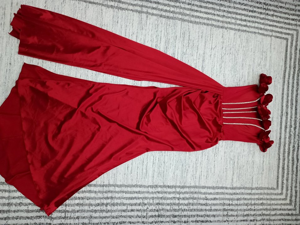 Parlak kırmızı, ipeksi kumaştan, drapeli ve V yakalı, uzun ve dar kesim kadın abiye. İnce askılı ve çağdaş athleisure tarzında, şık bir görünüm sunar. ✨