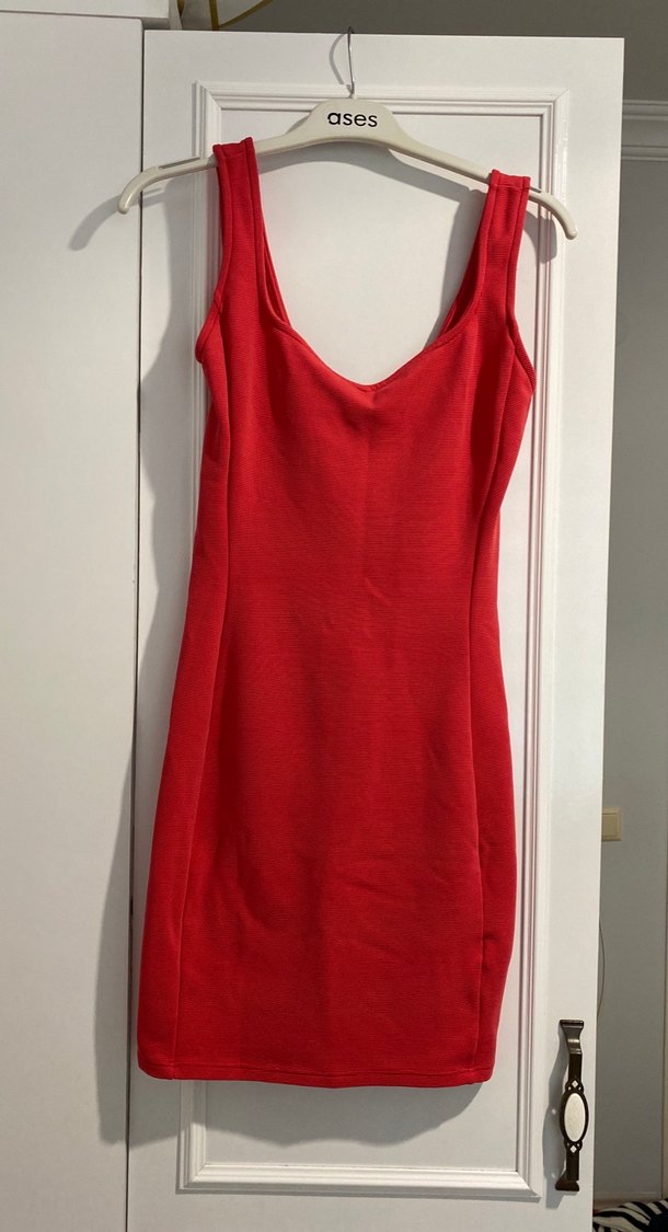 Kırmızı, parlak sentetik kumaştan yapılmış, V yakalı ve drapeli detaylı, kolsuz ve midi boyda dar kesim elbisedir.