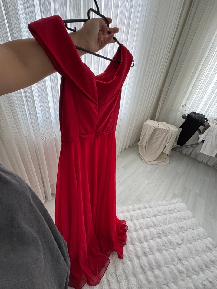 V yaka ve drapeli tasarıma sahip, parlak kırmızı renkte, kolsuz ve vücuda oturan midi uzunlukta abiye elbise. Düğünler için uygun. ✨