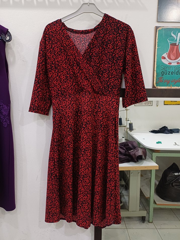 Koyu kırmızı baskılı, V yakalı, drapeli ve kısa kollu midi elbise, sentetik ve rahat bir kumaştan üretilmiştir.