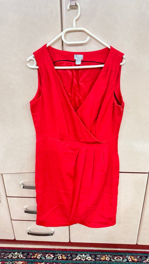 Kırmızı, drapeli detaylı, V yakalı ve kolsuz bu midi elbise, ofis için modern ve iddialı bir seçimdir. Parlak ve desensiz kumaşı şıklık katar.