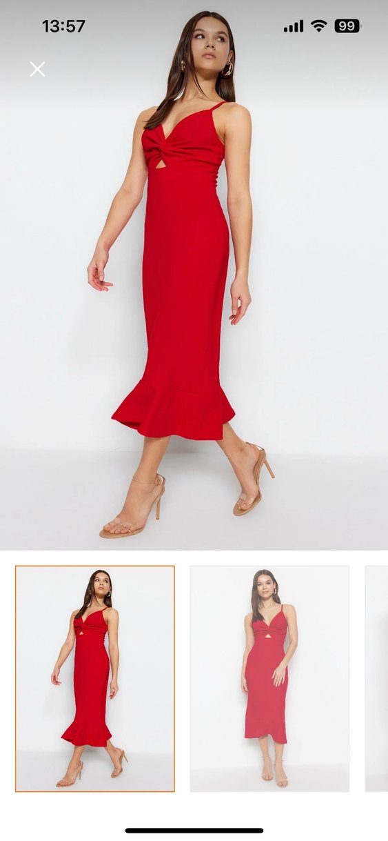 Parlak kırmızı, V yakalı ve drapeli detaylı, vücuda oturan midi elbise. İnce askılı kollarıyla çağdaş bir tarz sunar, romantik akşamlar için uygun. ❤️ 1 kez giyildi yeni çok şık