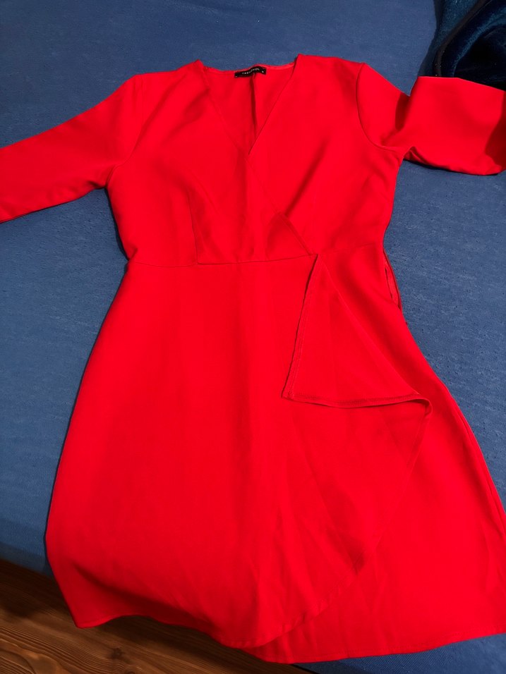 Kırmızı, v yaka ve drapeli detaylı, uzun kollu, normal boy midi elbisedir. Yumuşak dokulu kumaştan yapılmıştır, romantik akşamlar için uygundur. ❤️