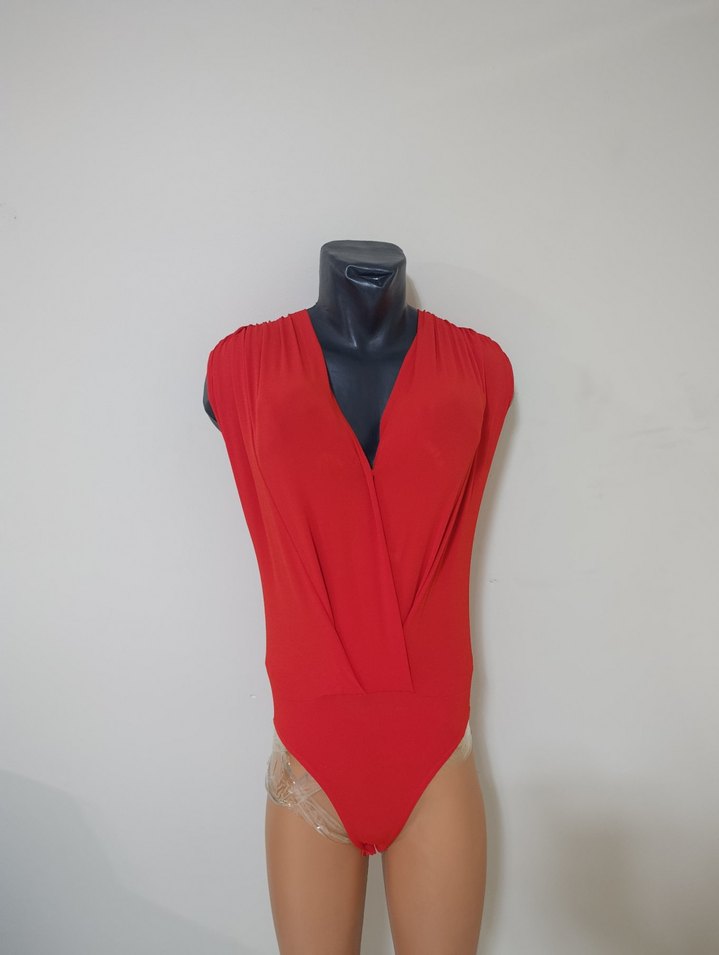 Kırmızı, V yaka ve drapeli detaylı kolsuz bluz. Sıkı kesimiyle cesur bir görünüm sunar. Sentetik kumaştan, günlük ve sokak stili için uygun.