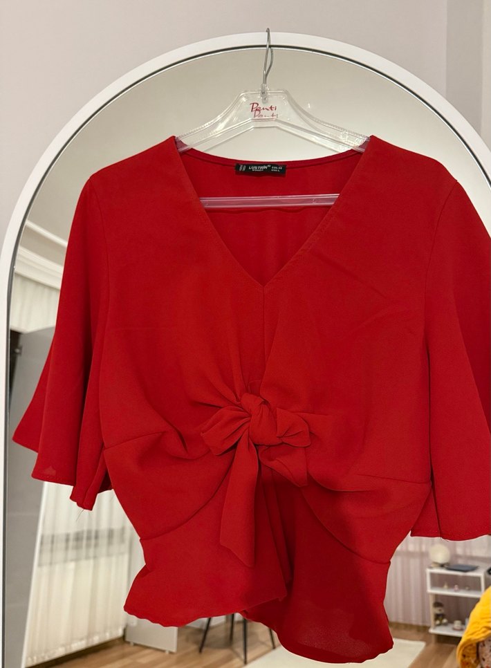 Kırmızı renkli, V yakalı, kısa kollu, bol kesim ve drapeli ön bağlamalı kısa uzunlukta kadın bluzudur. Parlak dokusu ve günlük sokak stili için uygundur.