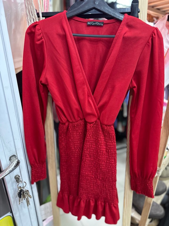 Kırmızı renk, V yakalı, uzun kollu, drapeli ve lastikli bel detaylı mini triko elbisedir. Rahat ve şık bir görünüm sunar. Ölçüleri iki kol arası 40 cm boyu 78 cm’dir Lütfen ölçülere bakarak alım yapınız iade kabul edilmemektedir anlayışınız için şimdiden teşekkürler.