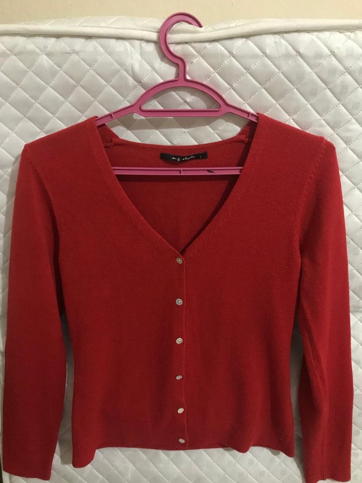 Kadınlar için koyu kırmızı renkte, V yaka ve düğmeli ön kısmı olan hırka. Uzun kollu, fitted kesim ve midi uzunluğunda, günlük kullanıma uygun örme kumaştan.