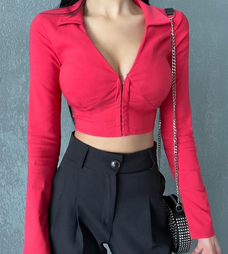 Kırmızı V Yaka Düğmeli Kadın Bluz