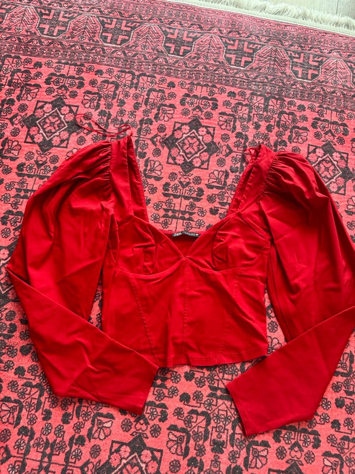 V yaka ve uzun kollu, düğmeli ön kısmı olan kırmızı, vücuda oturan kadın bluz. Düz, sentetik dokulu kumaştan ve midi uzunluğunda, vintage sokak stiline uygun. ❤️