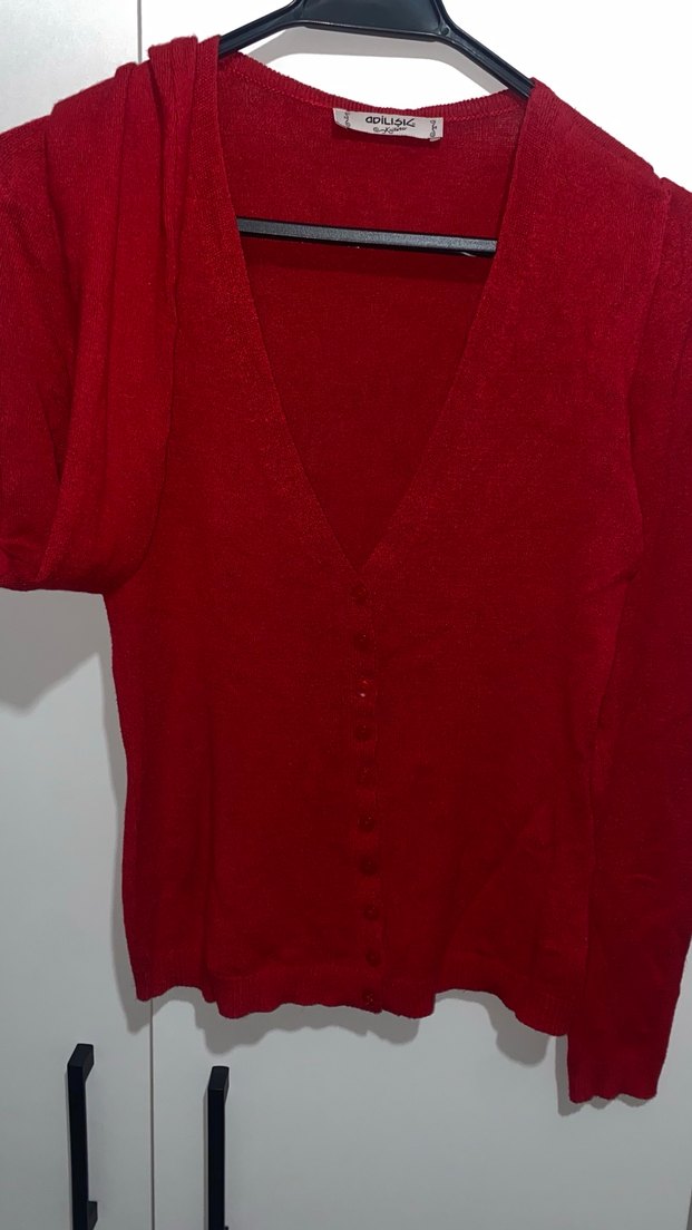 Kırmızı düğmeli, V yaka, uzun kollu, normal midi boyda, ipeksi dokulu, rahat ve şık kadın hırkası. Günlük kullanıma uygun.