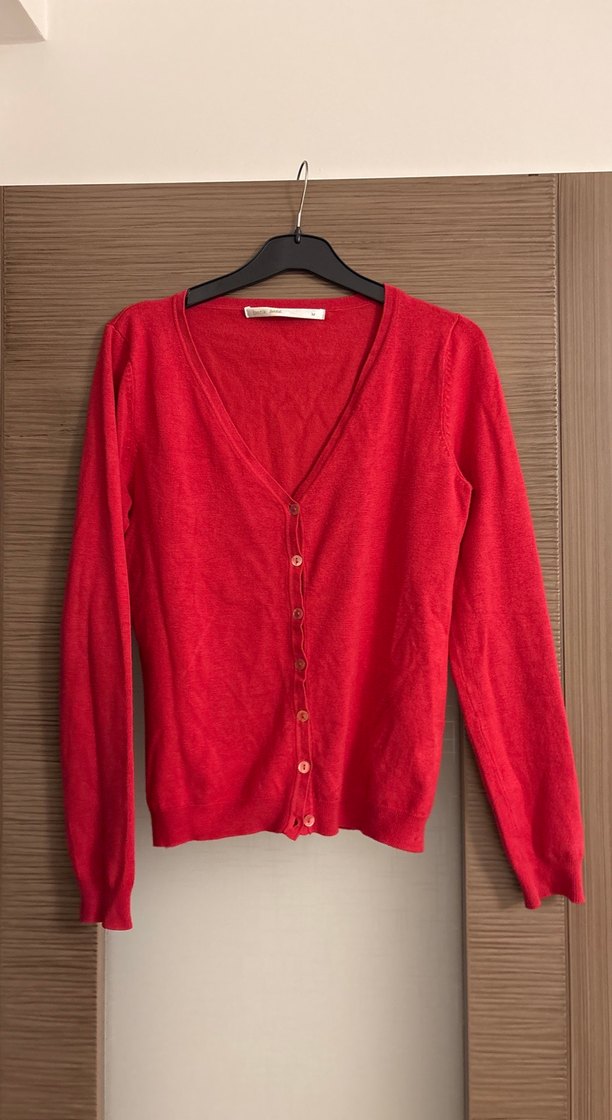 Açık kırmızı renkte, uzun kollu, V yakalı ve düğmeli kadın hırkası. Keten kumaştan, bol kesim ve midi boyda, günlük kullanım için uygundur.