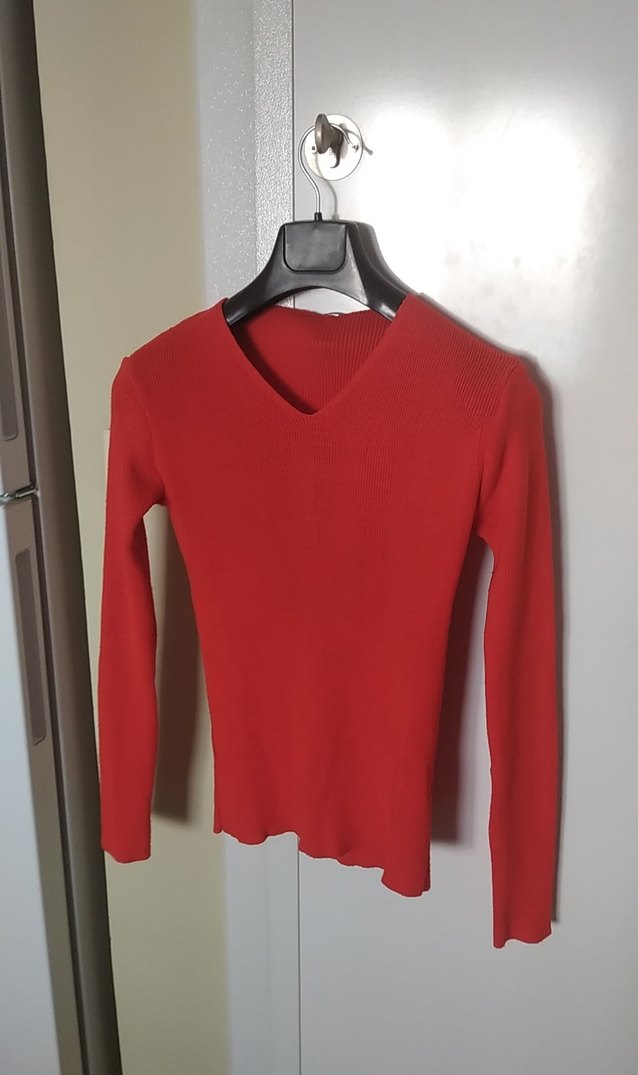 Kırmızı, düğmeli, V yaka, uzun kollu ve vücuda oturan kadın kazak. Normal midi uzunluğunda, gündelik sokak stiline uygun.