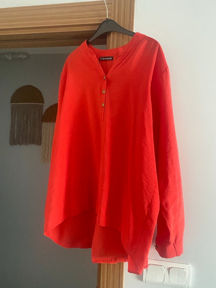 Kadınlar için uzun kollu, keten kumaştan rahat kesim gömlek. Parlak kırmızı renk, V yaka ve düğmeli ön tasarıma sahiptir. Günlük kullanıma uygundur.