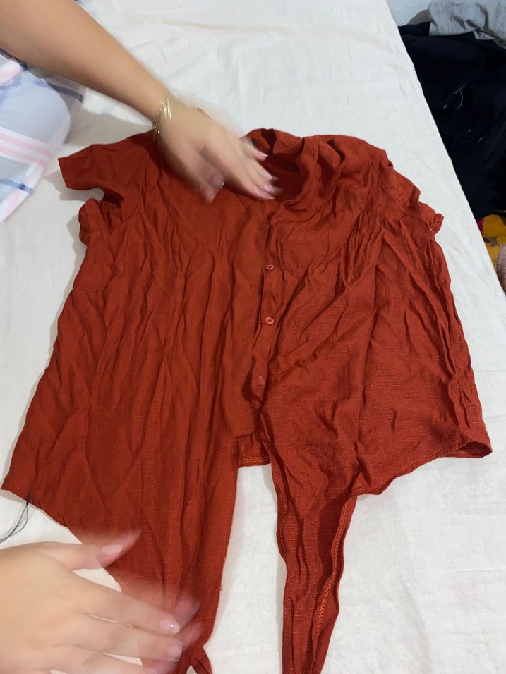 Keten kumaştan, düğmeli, kırmızı renkli, kısa kollu ve V yakalı, midi boy normal uzunlukta bol kesim kadın gömlek.