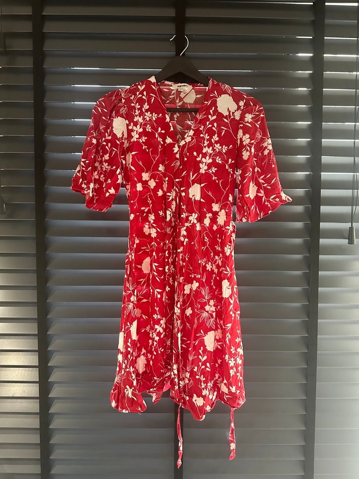 Kırmızı renkli, düğmeli, V yakalı, kısa kollu, bol kesim midi elbise. İpeksi dokusu ve renkli tie-dye deseniyle bohem tarzını yansıtır. Romantik akşamlar için uygun.