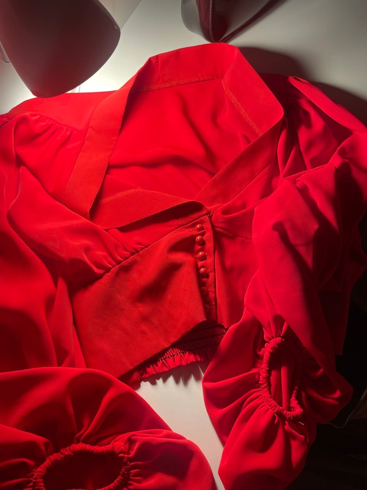 Parlak kırmızı, saten dokulu, düğmeli ön ve V yakalı, kısa mini kesim, dar kesim kadın bluz. Strappy kollu, romantik gece ve Paris sokak modasına uygun. ❤️