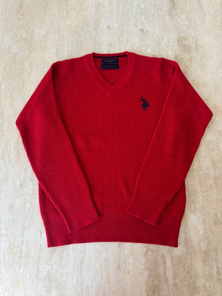 Örgü dokulu, V yakalı ve uzun kollu erkek çocuk yün kazak. Canlı kırmızı renkte, temiz kullanıldı, hafif tüylenmeleri var
