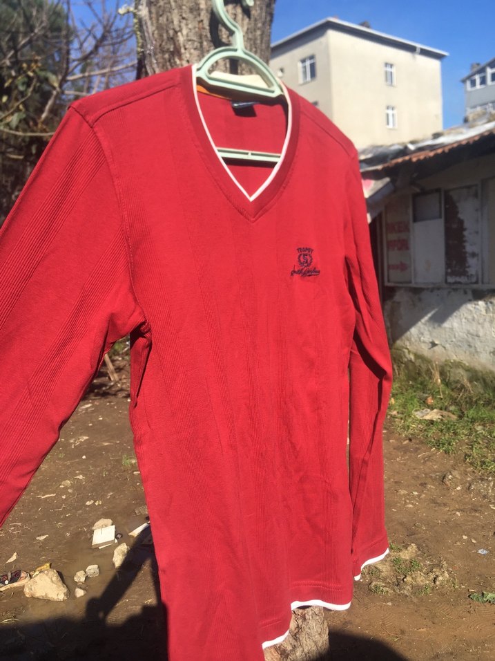 Pamuklu, uzun kollu, kırmızı V yaka erkek sweatshirt. Parlak rengi ve sade tasarımı ile rahat ve şık bir görünüm sunar.