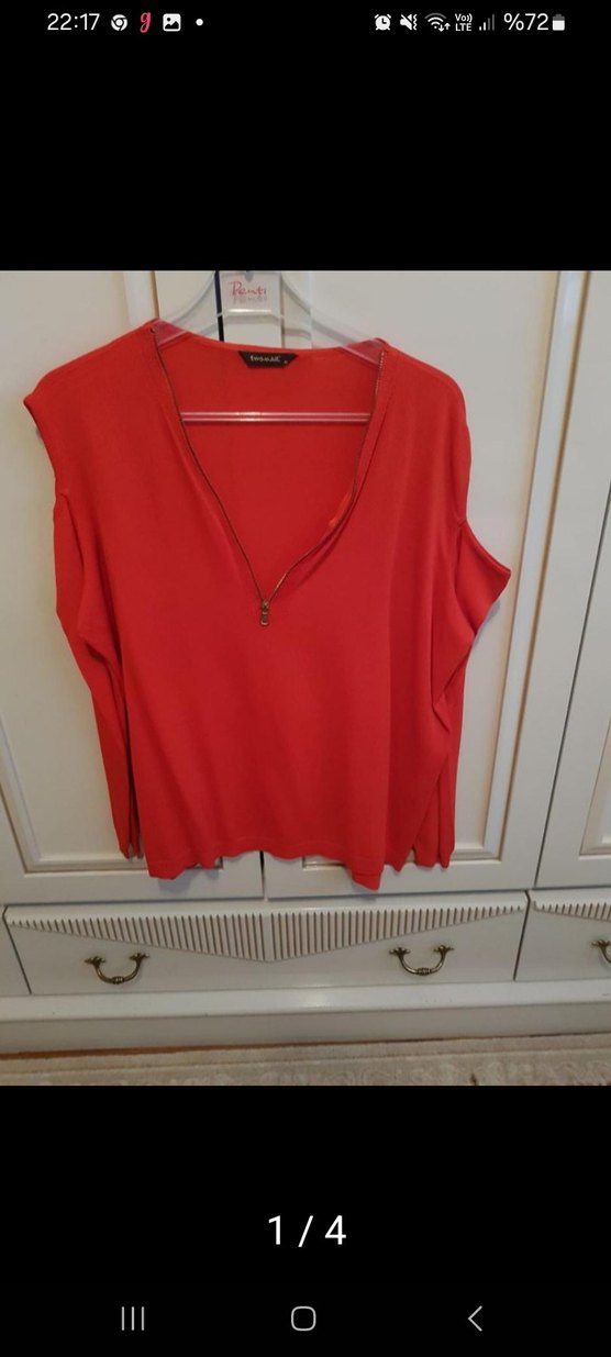 Kırmızı, V yaka ve kısa kollu, fermuarlı detaylı bol kesim kadın bluz. Parlak sentetik kumaştan, günlük sokak stili için uygun. ✨