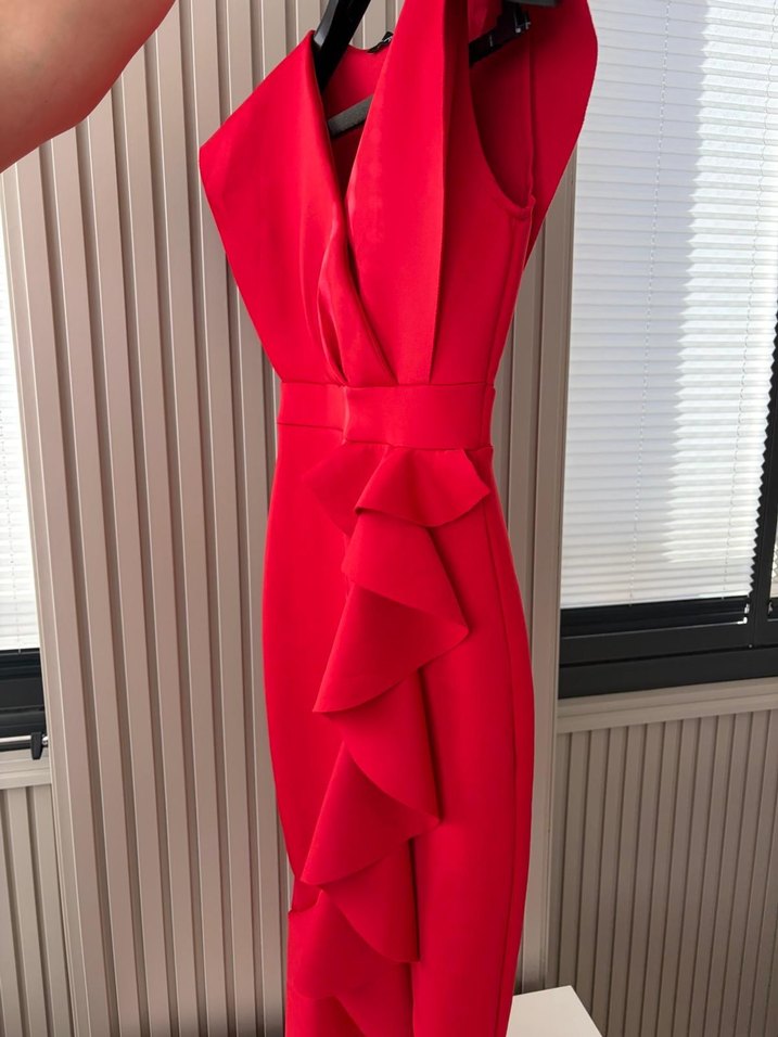 Ürün sadece 1 kere mezuniyette giyilmiş olup göğüs kısmında dekolte detayını önlemek amacıyla terzide dikim yapılmıştır.(istenirse açılabilir.) "S" beden olup kullanan kişi 53kg civarındadır. Kırmızı renkli, V yakalı ve önden fırfır detaylı, uzun ve dar kesim elbise.