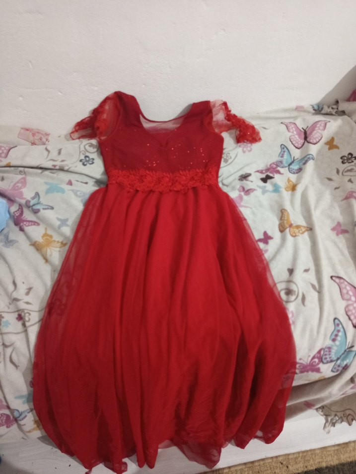 kısa kollu, V yakalı, fırfır detaylı kırmızı, bohem tarzda, yumuşak sentetik kumaştan yapılmış elbise.