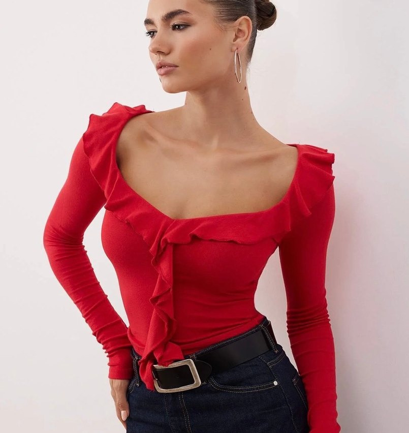 Parlak kırmızı, V yaka ve yaka boyunca fırfır detaylı, vücuda oturan uzun kollu kısa bluz. Sentetik kumaştan, günlük sokak tarzı için uygun.