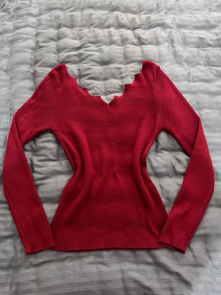 V yaka ve uzun kollu, yumuşak triko kumaştan yapılmış kırmızı renkli, fit kesim kadın kazak. Günlük kullanıma uygun sade ve rahat tasarım.