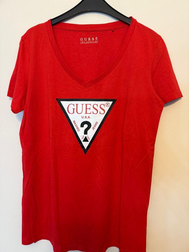 ürün orijinaldir hiç giyilmedi. Kırmızı renkli Guess tişört, V yaka ve kısa kolludur. Pamuk kumaştan yapılmış, parlak görünüm ve baskılı logo ile sportif ve rahat bir stil sunar.