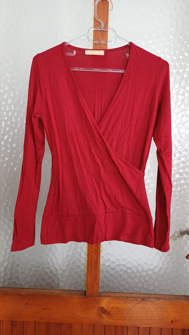 Kırmızı, V yakalı, uzun kollu, drapeli, normal midi boyda, ince ve parlak dokulu bluz Günlük kullanıma uygun sade tasarım.