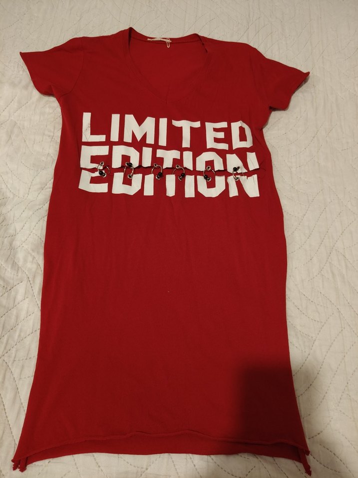 Parlak kırmızı renkte, baskılı "LIMITED EDITION" yazılı, kısa kollu, V yaka, pamuklu kumaştan, normal midi uzunlukta, dar kesim hamile tişörtü.