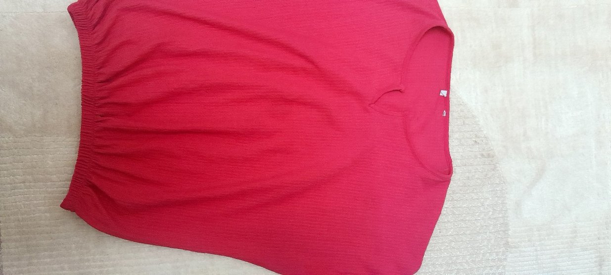 Kırmızı parlak sentetik kumaştan, kısa kollu ve V yaka hamile tişörtü. Yan yırtmaçlı, midi boyda ve spor tarzına uygun.